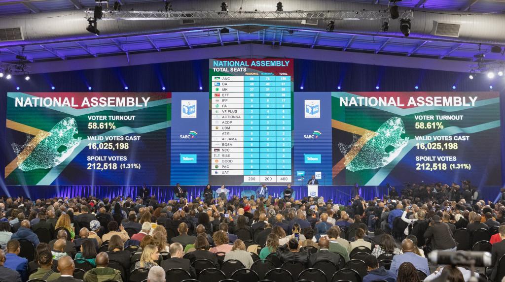 6月2日,在南非米德兰的大选计票中心,电子显示屏显示南非大选最终计票结果。新华社记者张誉东摄