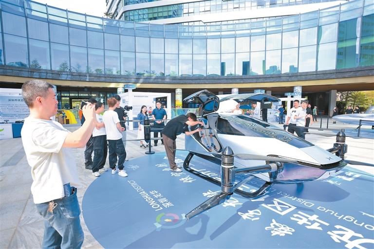 龙华区低空经济产业峰会期间,参会嘉宾参观无人机。