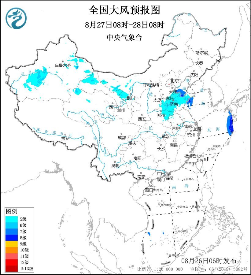 8月27日08时至28日08时,甘肃河西、内蒙古西部、河北南部、山东大部、河南北部等地部分地区有5~6级、阵风7~8级的大风;莱州湾、山东半岛东部部分沿岸海域将有8级、阵风9~10级的偏东风。