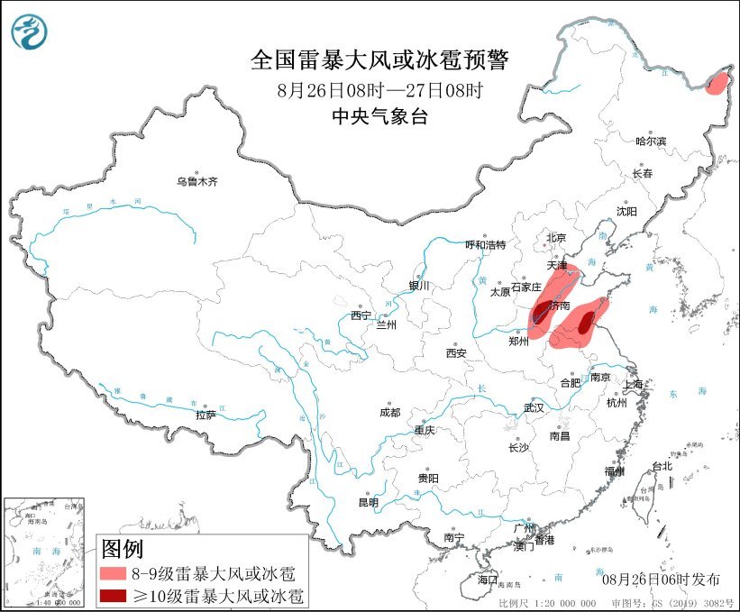预计8月26日08时至27日08时,华北中南部、黄淮等地的部分地区将有8级以上雷暴大风或冰雹天气,其中,河北东南部、山东西部和南部、河南北部、江苏北部等地的局地风力可达11级;华北中南部、黄淮、西南地区南部、华南南部等地的部分地区将有小时雨量大于20毫米的短时强降水天气,其中,河北中南部、天津南部、山东、河南北部等地的部分地区小时雨量大于50毫米,最大可达80毫米以上。