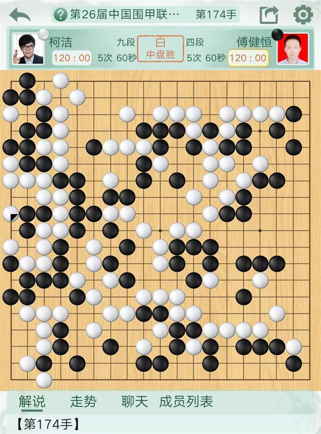 紧接着,二台的柯洁执白胜傅健恒。官子时候局面复杂。黑棋突然连续出现失误将自己超级大龙走死,棋局戛然而止白胜。