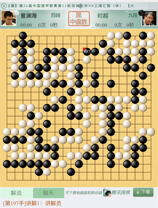 当天最早胜出的是快棋台,时越执黑胜曾渊海。白棋布局套路之后,显得功力不足。白棋在左边和右上角都下出俗手,黑棋获得便宜后大幅领先。之后白棋再无机会。