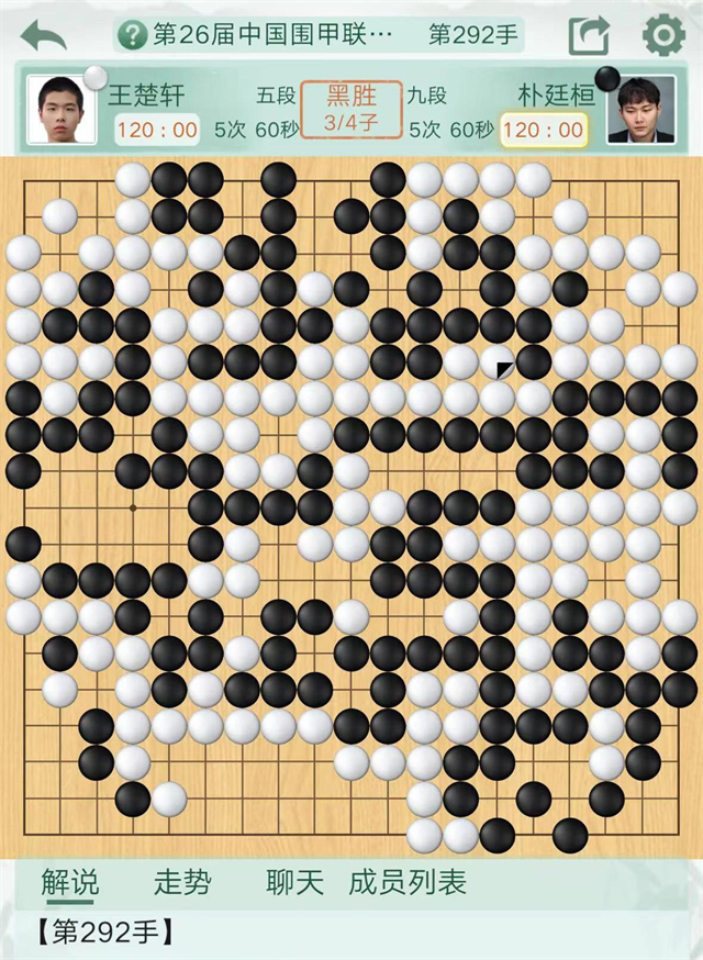 处在第一台的朴廷桓随后执黑胜王楚轩。开局白棋右边棋形处理出现失误,黑棋攻击获利后优势。之后黑棋稳扎稳打,官子阶段小有退让后获胜。