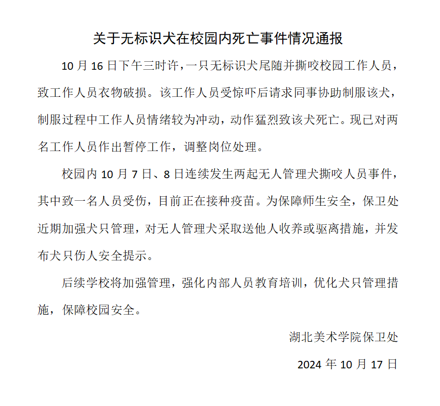 10月17日,湖北美术学院通报,无标识犬尾随撕咬工作人员,其请求同事协助,制服中动作猛烈致犬死亡。此前校园连发犬撕咬人事件,致一人受伤。