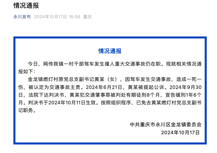 金龙镇燃灯村原党总支副书记黄某(女),因驾车发生交通事故,造成一死一伤,被认定为交通事故主责。2024年6月21日,黄某被提起公诉。2024年9月30日,法院下达判决书,黄某犯交通肇事罪被判处有期徒刑8个月,宣告缓刑1年6个月。判决书于2024年10月11日生效。按照组织程序,已免去黄某燃灯村党总支副书记职务。