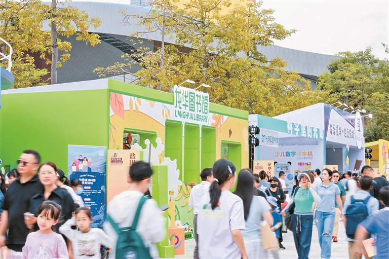 龙华新闻讯(记者 袁春燕 通讯员 黄小粤 萧蕾 文/图)11月2日至3日,由深圳图书情报学会、深圳图书馆联合全市公共、高校图书馆共同举办的深圳市第八届“阅在深秋”公共读书活动在深圳图书馆水幕广场火热进行。来自全市的22家公共图书馆、高校图书馆、文化企业与社会阅读组织以阅读为媒,通过精心布置阅读空间,以主题展示、非遗体验、阅读交流、科技互动等方式,多元展示深圳全民阅读新生态,进一步打造人人可读、处处可读、时时可读的全民阅读氛围。