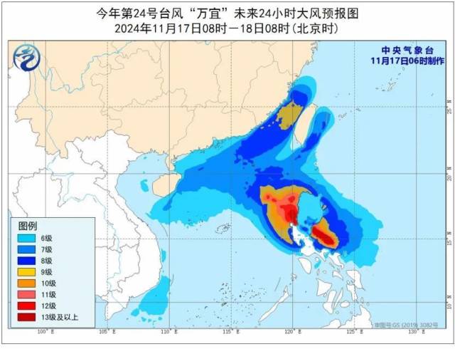 11月18日8时至19日8时,西藏北部和西部、青海南部、黑龙江东部、浙江东部、福建东部、广东东部、台湾岛等地有5至6级、阵风7至8级的大风。黄海中部和南部海域、东海大部海域、台湾海峡、台湾以东洋面、巴士海峡、南海北部和中部海域将有7至8级、阵风9级的大风,其中台湾海峡和南海北部部分海域风力可达9级、阵风10至11级,台风“万宜”中心经过的附近海域风力可达10至12级、阵风13至14级。