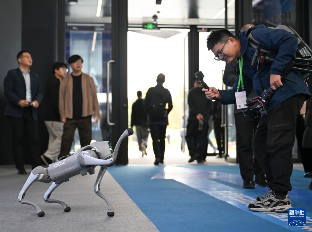 11月19日,在2024年世界互联网大会“互联网之光”博览会上,参观者与一款智能机器狗互动。新华社记者 蔡湘鑫 摄