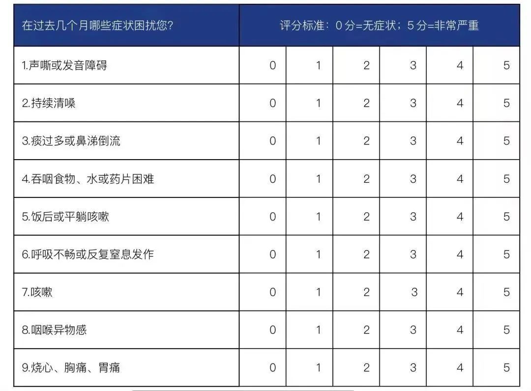 如果你出现咽喉异物感,需要反复清嗓、干咳,但咳不出来也咽不下去,同时还时不时伴有反酸等症状,不妨按照下表自测一下,看看自己是否患上了反流性咽喉炎。