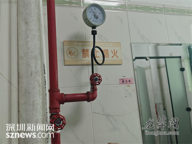 执法人员一行前往建筑内部测试末端试水装置。“末端试水装置是安装在系统管网最不利点喷头处,用于检验系统启动、报警及联动等功能的装置。”执法人员说。现场对末端试水装置的测试,从压力表的数值来看,管网系统的反馈和压力正常。
