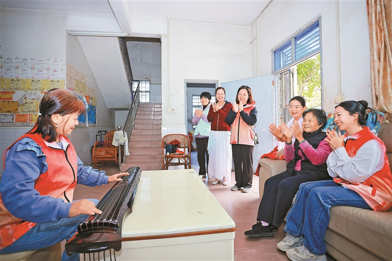 志愿者上门为牛湖社区陈飞旋阿婆献上歌舞节目《珊瑚颂》。
