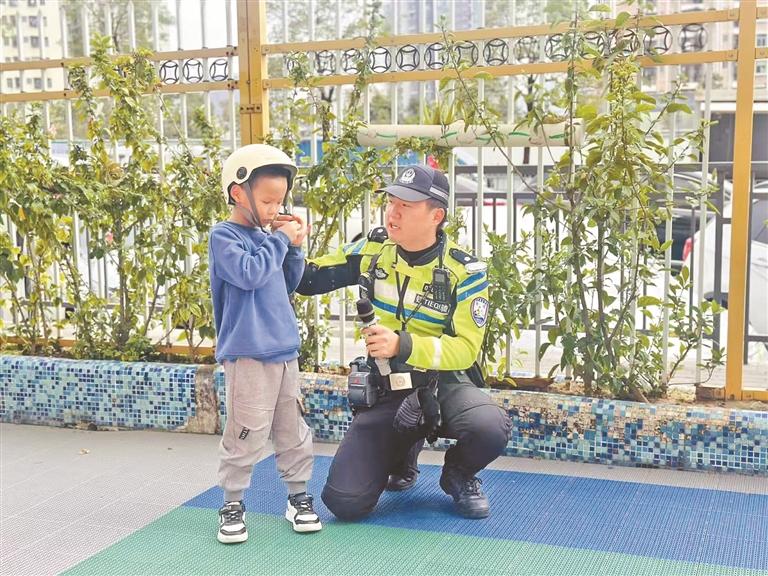 铁骑队员向小朋友们示范如何正确佩戴头盔。