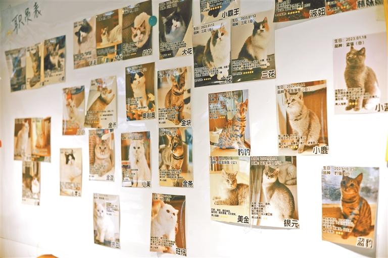 “营业喵”们也分营业和休息时间,“我们实行轮休制。有些猫咪消极怠工或者是前一天营业特别卖力,会让它们先休息,过一两天再营业。”朋朋介绍,由于猫咪较多,目前团队成员对收猫特别谨慎,“时间、精力有限,无法在现阶段继续领养更多猫。”朋朋说,小伙伴们都有业务项目在手,猫满园的存在,让大家在完成主线任务的同时也有了支线任务“考核”。大家齐心协力,排班轮值,一起把猫满园运营下去。