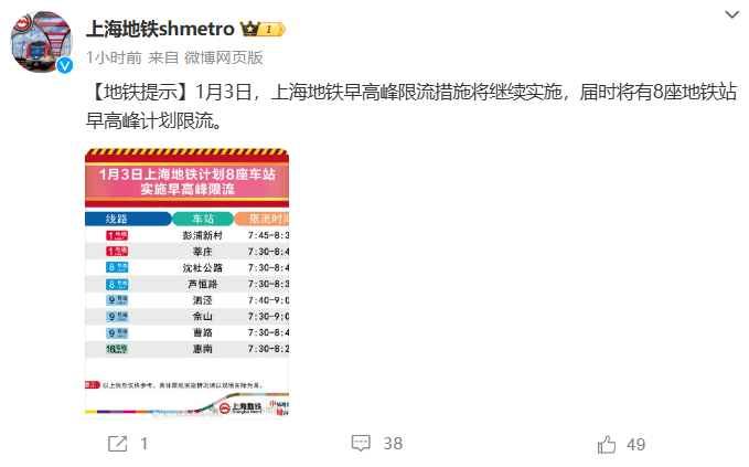 值得一提的是,1月2日下午,上海地铁连发两条推文,称将对上海地铁早高峰继续实施限流措施,同时还将向乘客提供地铁乘坐舒适度预告。