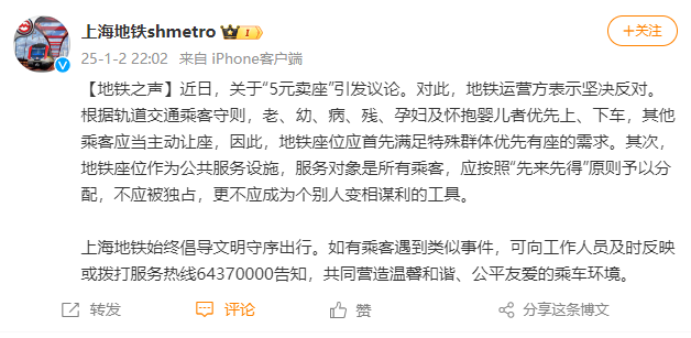 1月2日,上海地铁发文表示:“近日,关于‘5元卖座’引发议论。对此,地铁运营方表示坚决反对。”