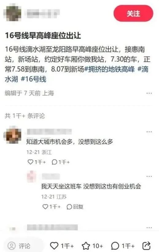 此前,网友“临港小王子”在社交网站发文称,出让上海地铁16号线滴水湖至龙阳路方向的早高峰座位,“接惠南站、新场站”“约定好车厢,你坐我站”。