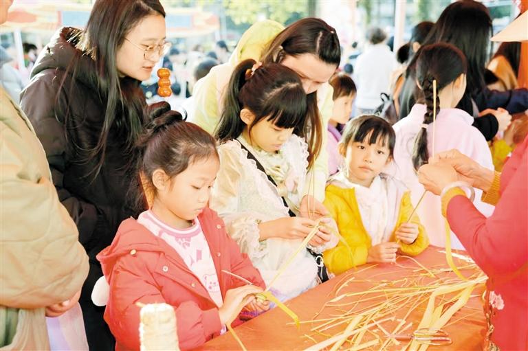 年俗体验区人气爆棚,12个年俗摊位精彩纷呈,让市民们在参与中体验传统年俗的乐趣。冰糖葫芦、糖画义卖摊位前香气四溢,吸引了众多居民购买品尝;风车随风转动,带来新春的活力;草编、剪纸、中国结、捏泥人、扇画等传统手工艺品制作摊位前,居民们在志愿者指导下亲身体验,感受传统技艺的魅力;书法家们现场挥毫泼墨写春联,为大家送上新春的祝福;娣黄酒、萝卜粄等美食让居民品尝到家乡的味道;丢圈圈摊位前围满了跃跃欲试的参与者;全家福拍照区温馨满满,为居民们定格下幸福的瞬间。