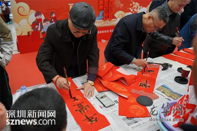 在候车大厅的另一侧,“送福”活动也在如火如荼地进行着。深圳车站特邀书法家们笔走龙蛇,力透纸背,一幅幅寓意吉祥的对联和“福”字跃然纸上。