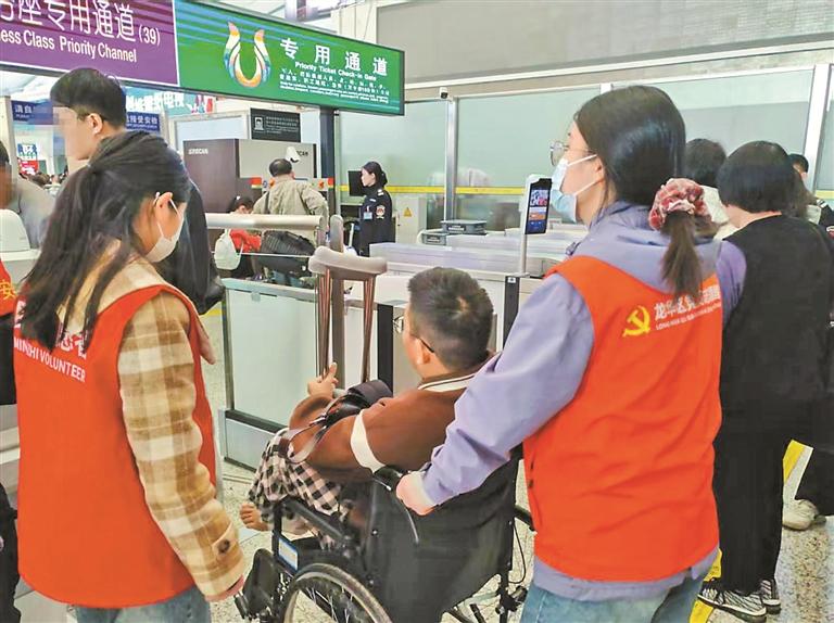 北站先锋服务队队员护送行动不便的旅客。