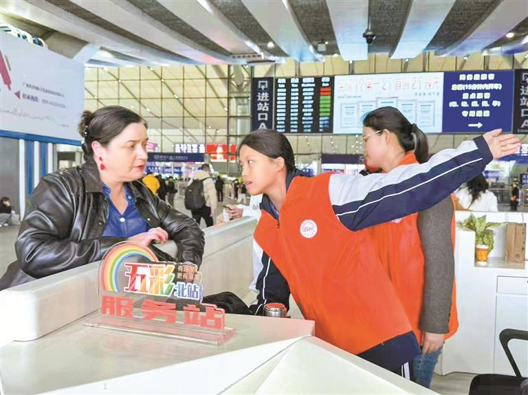 北站先锋服务队队员为外籍旅客提供指引。