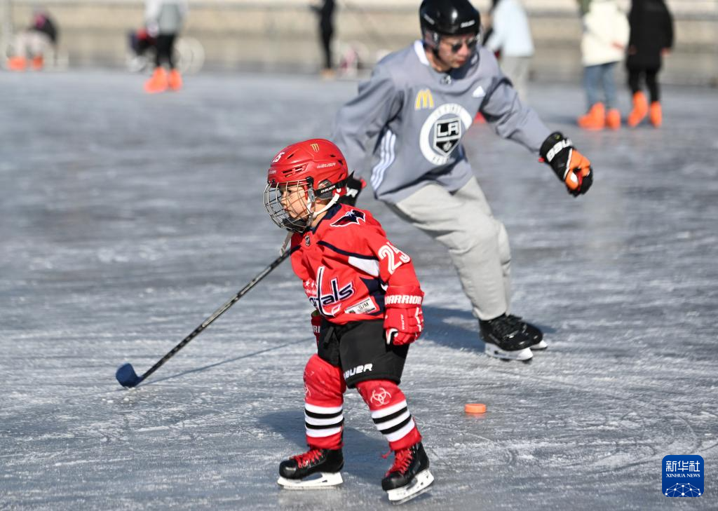 1月19日上午,在北京什刹海冰场,小朋友在练习冰球。