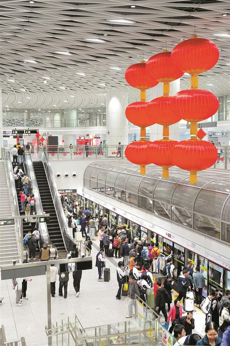 走进地铁站,福字、窗花、灯笼……往日的冷硬金属色调已被暖黄色灯光和中国红所替代,更有地铁站精心布置了小型“新春打卡点”,吸引着乘客们驻足留影。作为城市交通的细微脉络,公交站台也在这新春的氛围中焕发出了新的活力。站台上,灯箱广告已换上了蛇年新春的主题海报,“深爱你,就要年在一起”等新春祝福语,温馨提醒着人们团圆的日子已近在咫尺。深圳宝安国际机场和深圳北站同样弥漫着温馨祥和的气息。灯笼高挂、福字贴门,新年主题的快闪节目更是为旅客们带来了意外的惊喜和欢乐。