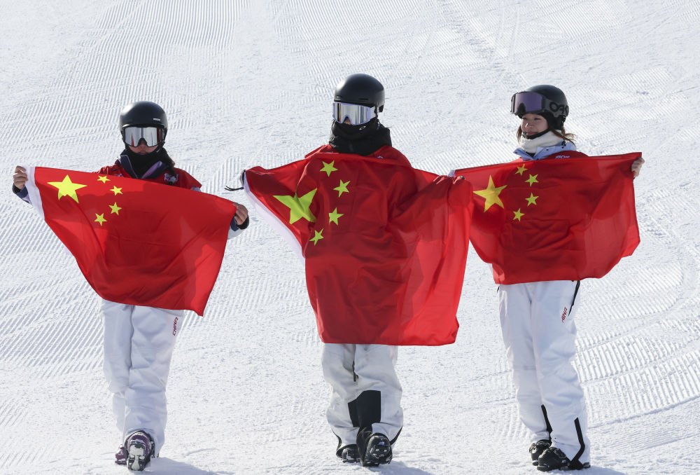 2月11日,刘梦婷(中)、杨如意(右)、韩林杉在赛后庆祝。当日,第九届亚冬会自由式滑雪女子坡面障碍技巧决赛在亚布力举行。中国选手刘梦婷获得冠军,杨如意获得亚军,韩林杉获得季军。新华社记者 杨青 摄