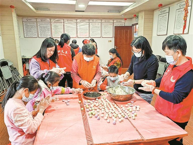 桂花社区志愿者和居民齐聚一堂搓汤圆,共庆元宵佳节。