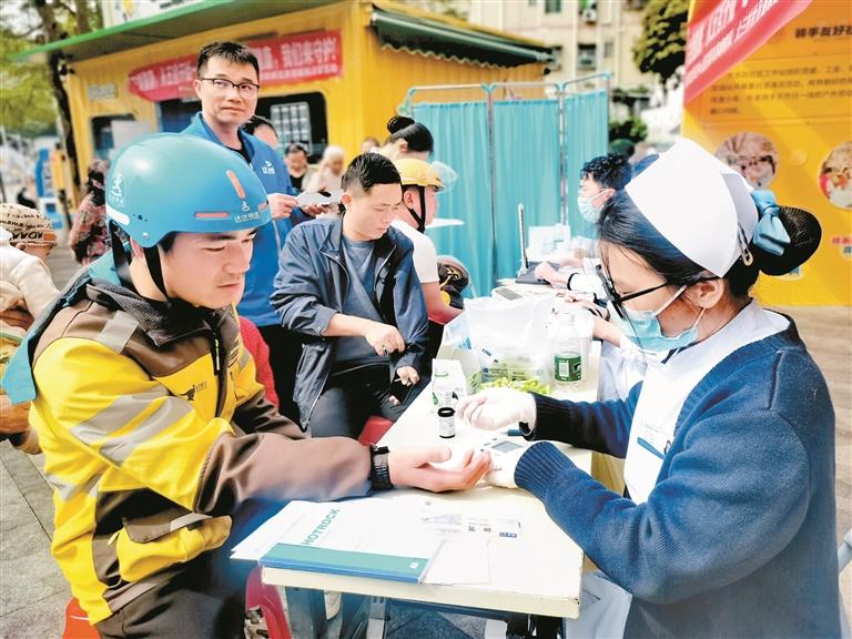 其间,一位骑手在得知自己血压过高后,表现出明显的焦虑与担忧情绪。社区工作人员见状迅速上前,耐心安抚他的情绪,并邀请医生现场为该骑手提供专业的健康建议,并详细讲解医保政策以及相关的报销流程。在社工与医生的悉心指导和鼓励下,这位骑手决定当天下午前往龙华区中心医院做进一步检查。
