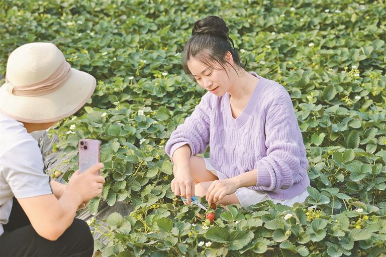 ▲在观澜版画村的草莓园里,游客们采摘鲜红欲滴的草莓。