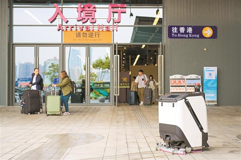 几乎同一时间,3公里外的皇岗口岸,正在调试的智能清洁机器人正灵活地穿梭于旅检长廊等区域。此次试点的智能清洁机器人集“尘推、吸尘、清洗”三大功能于一体,可自主完成地面除尘、污渍清洁、消毒养护等全流程作业。清洗面积最高可达2000平方米/小时。