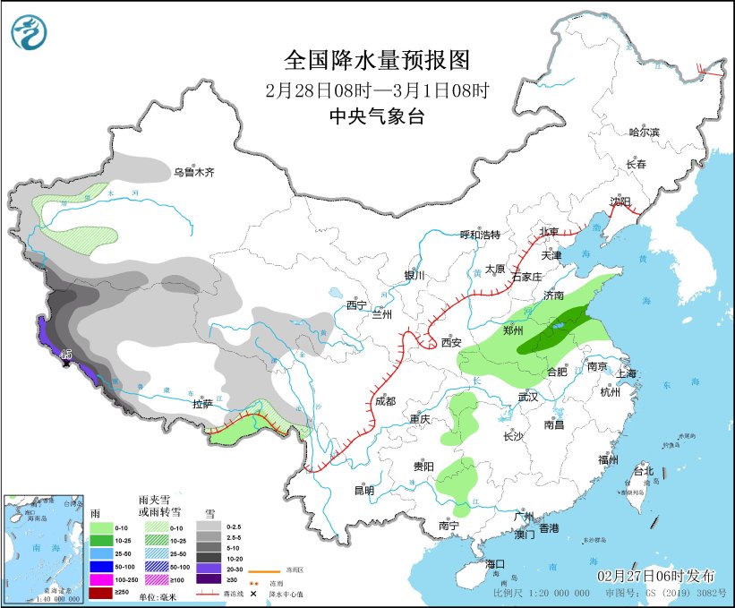 2月28日08时至3月1日08时,新疆南疆西部山区、西藏西部等地部分地区有中到大雪,其中,西藏西部部分地区有大暴雪,局地特大暴雪(30~45毫米)。黄淮大部、江淮北部、江汉东部等地部分地区有小到中雨,局地有大雨。黑龙江东北部部分地区有4~5级风。