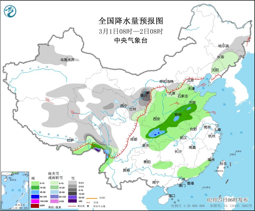 3月1日08时至2日08时,西藏东部、青海东部、西北地区东部等地部分地区有小到中雪或雨夹雪,其中,内蒙古河套地区、宁夏中北部等地部分地区有大到暴雪(10~13毫米)。黄淮西部、江汉西部、西南地区东北部等地部分地区有中到大雨,局地有暴雨。青海西部、山西南部等地部分地区有4~6级风。