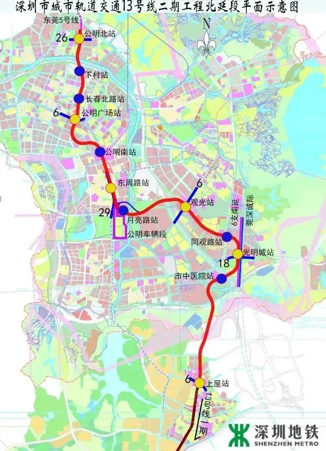 13号线二期(北延)起于上屋站(不含),止于公明北站,线路全长约19.23km,设站11座,车辆段1座,全部采用地下敷设。站点包括红坳公园站、光明城站、德雅路站、凤凰城站、月亮路站、将围站、新庄站、公明广场站、上村站、下村站、李松蓢站。