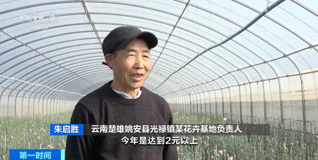 云南楚雄姚安县光禄镇某花卉基地负责人 朱启胜:去年价格是0.6元一枝,今年能够达到2元以上,平均价格都是在1.5元以上了。