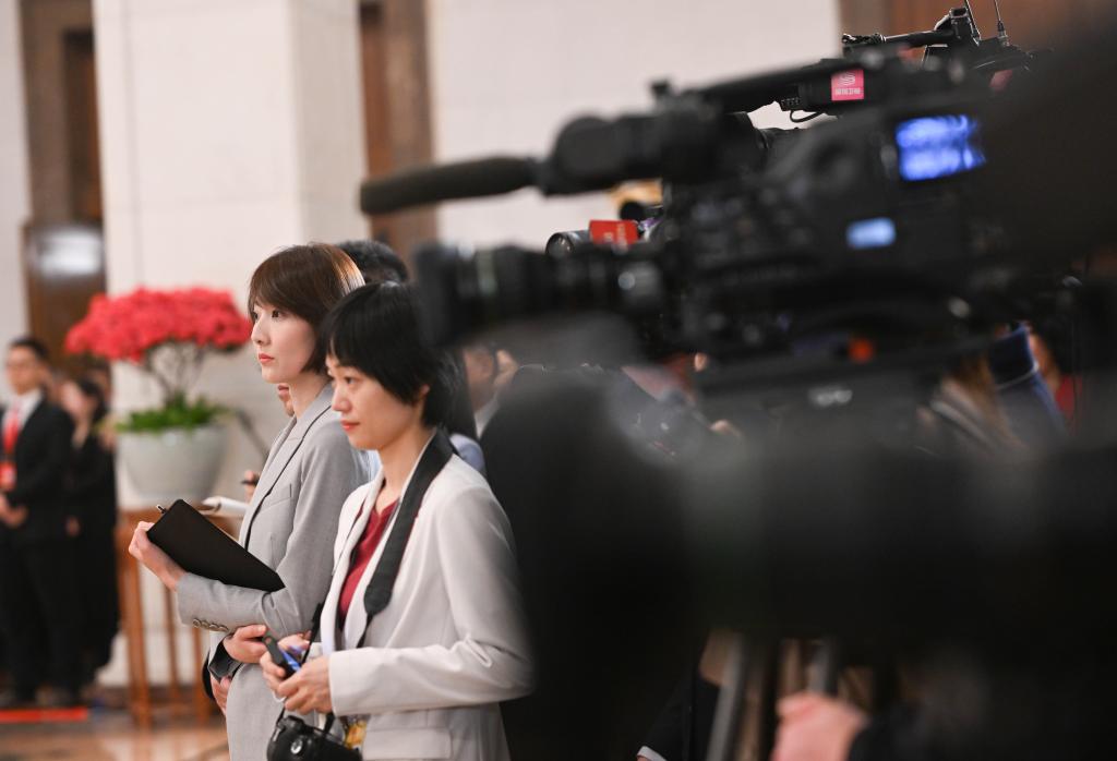 3月11日,第十四届全国人民代表大会第三次会议第三场“代表通道”集中采访活动在北京人民大会堂举行。这是记者在现场采访。
