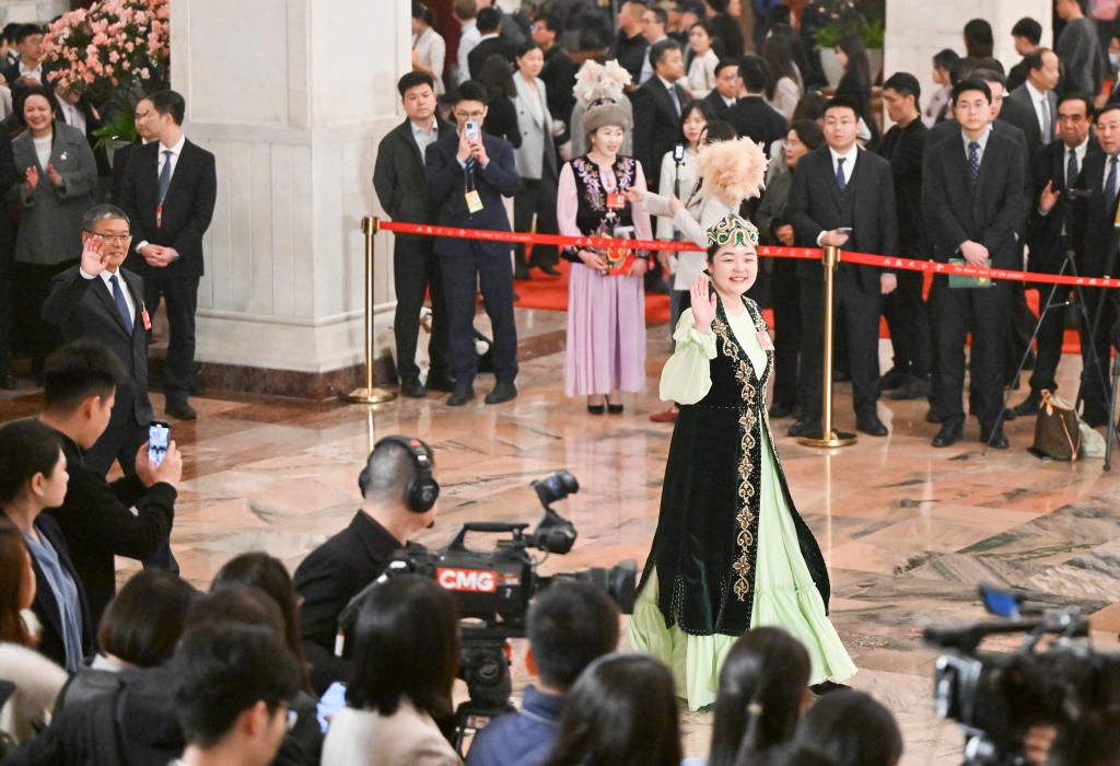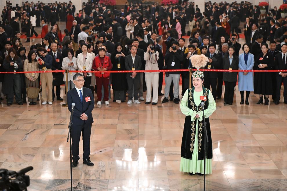 3月11日,第十四届全国人民代表大会第三次会议第三场“代表通道”集中采访活动在北京人民大会堂举行。这是全国人大代表卓娅·巴合提接受媒体采访。