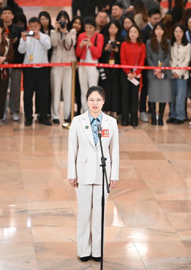 3月11日,第十四届全国人民代表大会第三次会议第三场“代表通道”集中采访活动在北京人民大会堂举行。这是全国人大代表谭新萍接受媒体采访。