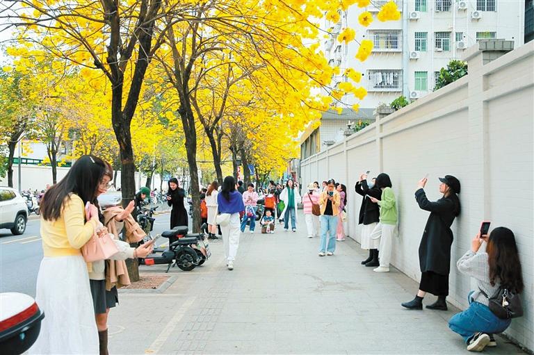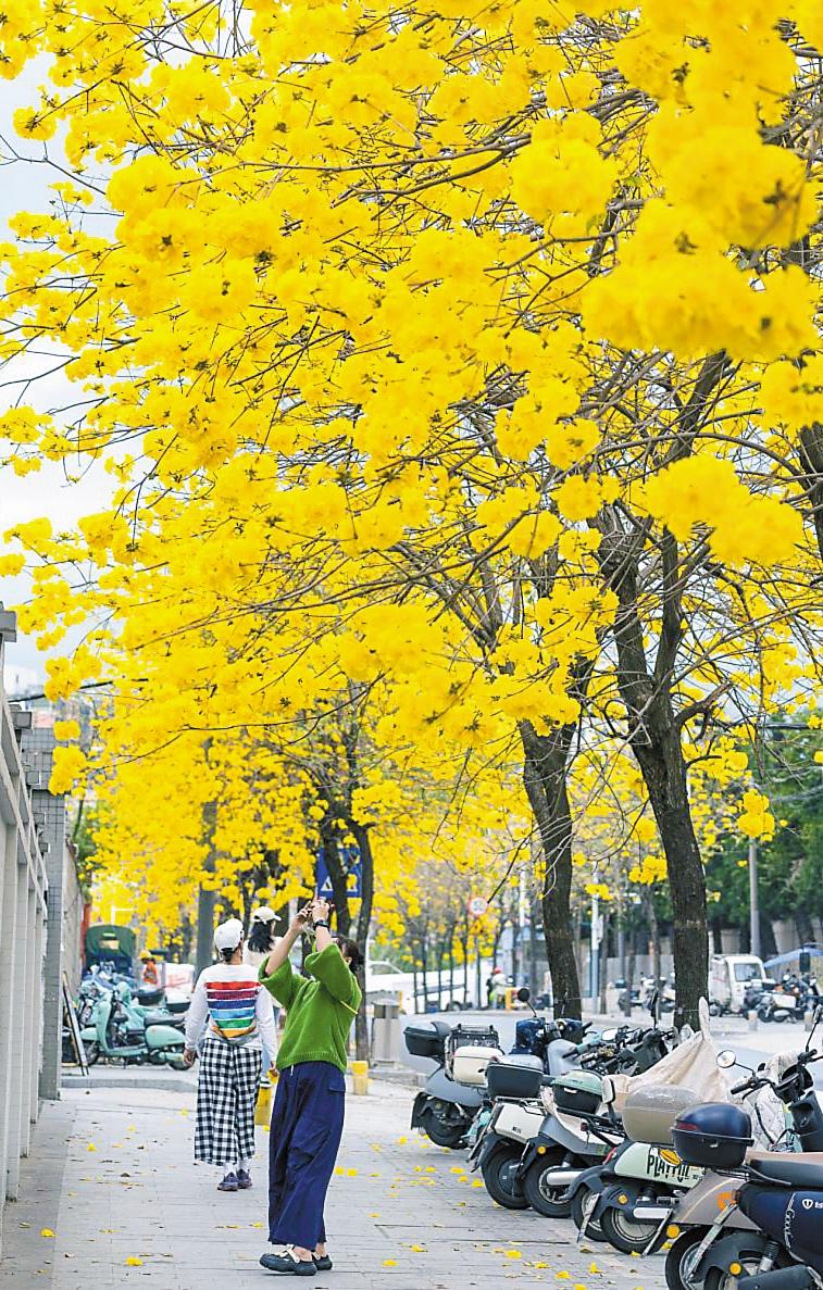 盛开的黄花风铃木吸引不少市民来到美宝路拍照打卡。