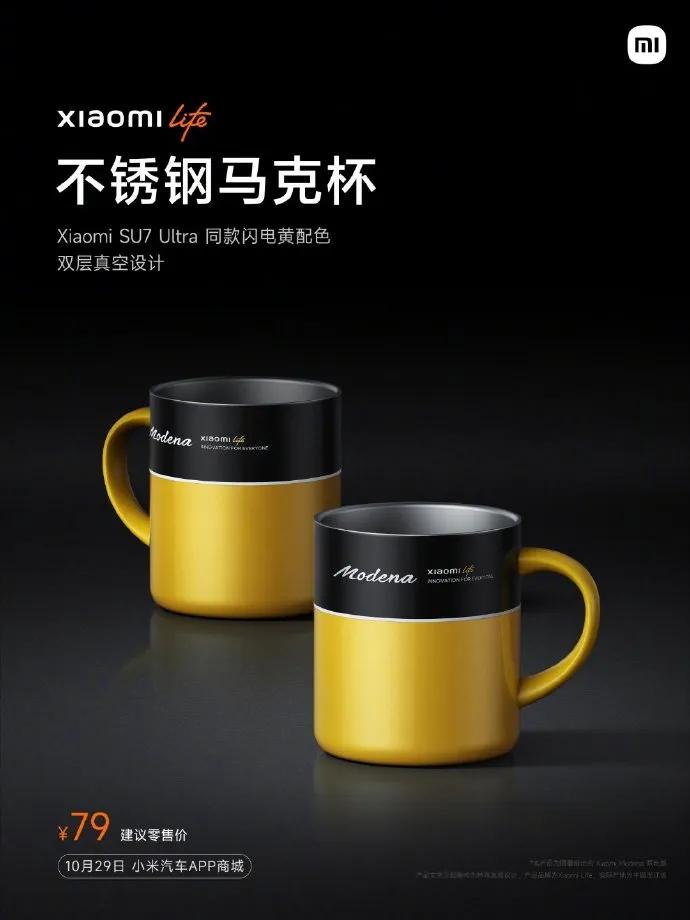 有细心的网友发现,雷军同时发布了一张“不锈钢马克杯”的产品图。配图显示,其拥有“小米SU7 Ultra同款闪电黄配色”,双层真空设计,售价为79元。