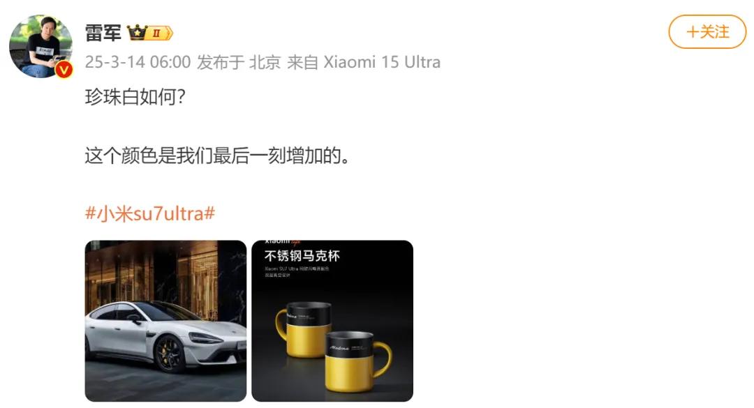 3月14日,雷军在社交平台发文分享小米SU7 Ultra珍珠白配色,并配文“珍珠白如何?这个颜色是我们最后一刻增加的。”