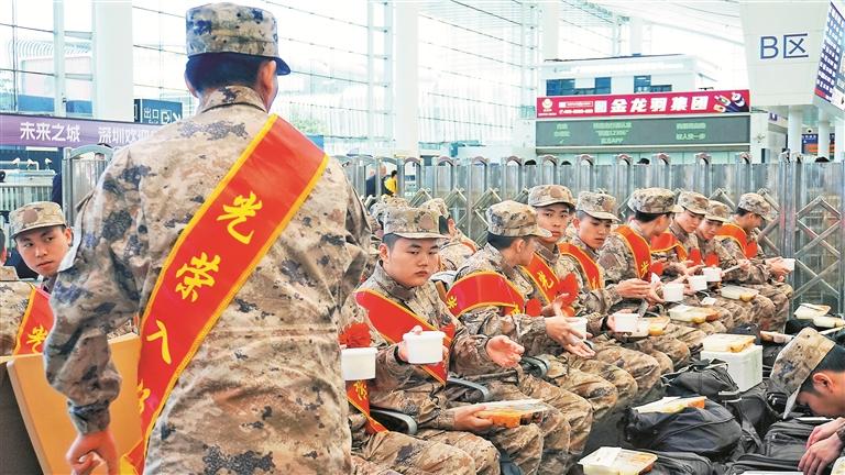 深圳新闻网2025年3月17日讯(深圳晚报记者 秦瑶 文/图) 16日11时许,深圳北站军人候车区内饭菜香弥漫在空气中,一批批佩戴着绶带和大红花的新兵有序入场,吃上了“两荤两素一汤一咸菜”的热乎饭菜——这是由深圳军供站精心搭配当天运送来的军供餐食。随着春季新兵运输正式启动,深圳军供站开启全链条保障模式,在深圳北站、深圳站、深圳东站、深圳机场等设置了多个军供保障点,全力护航春季入伍新兵踏上保家卫国的新征程,首日服务保障入伍新兵达 1500人次。