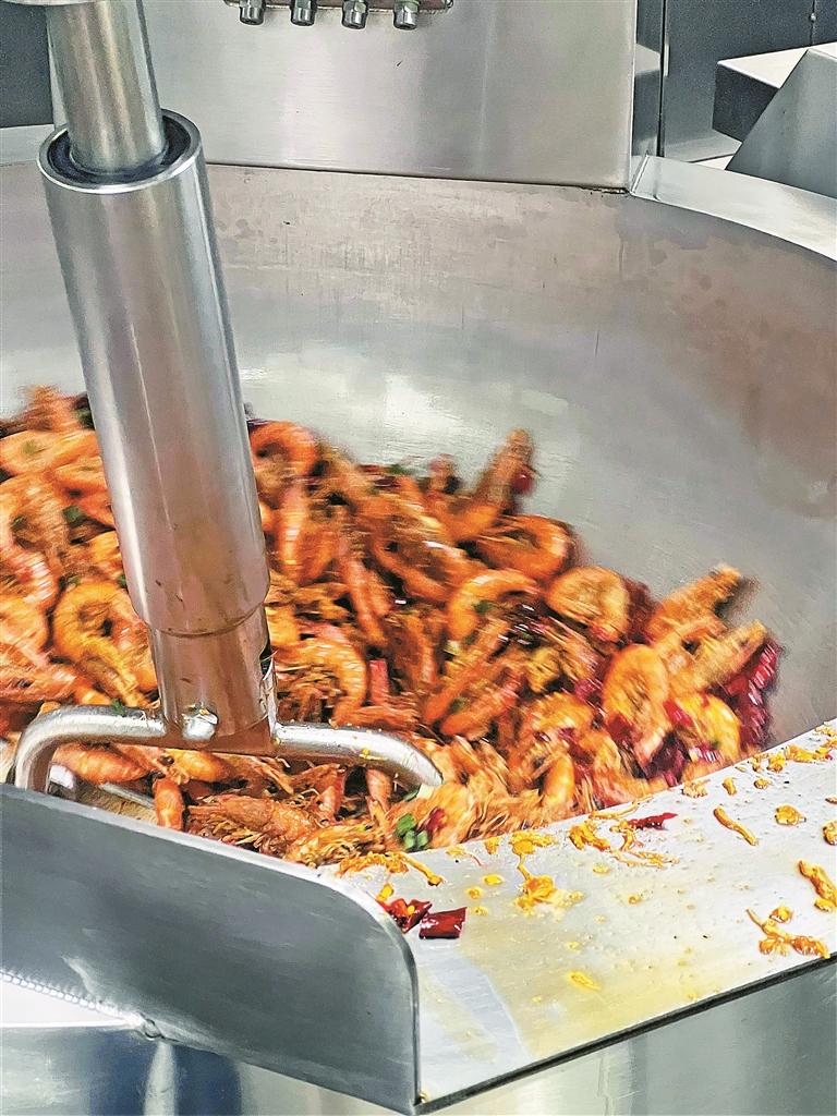 8时左右,食材准备就绪,炒菜机器人隆重登场。工作人员选定好菜谱,倒入食材,炒菜机器人便转动着巨大的斗形锅开始炒制大虾,中途还能自动加喷调料。同一时间,几台智能化蒸箱也运转起来,开始蒸米饭和鸡肉。“这些智能设备推动单锅产能提升至传统模式的3倍。”深圳军供站六级职员张兆军介绍道。