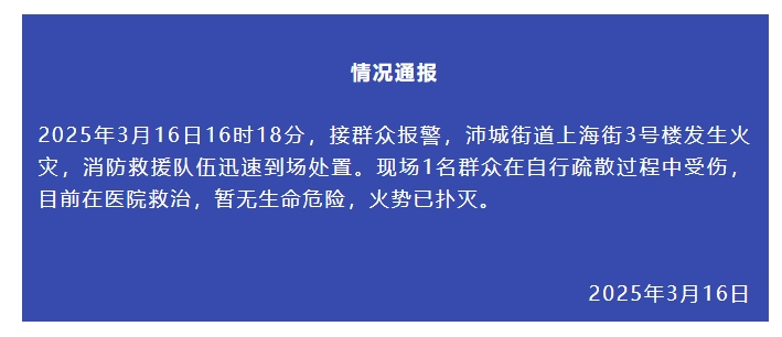 据“沛县发布”微信公众号3月16日发布情况通报:3月16日16时18分,接群众报警,沛城街道上海街3号楼发生火灾,消防救援队伍迅速到场处置。现场1名群众在自行疏散过程中受伤目前在医院救治,暂无生命危险,火势已扑灭。