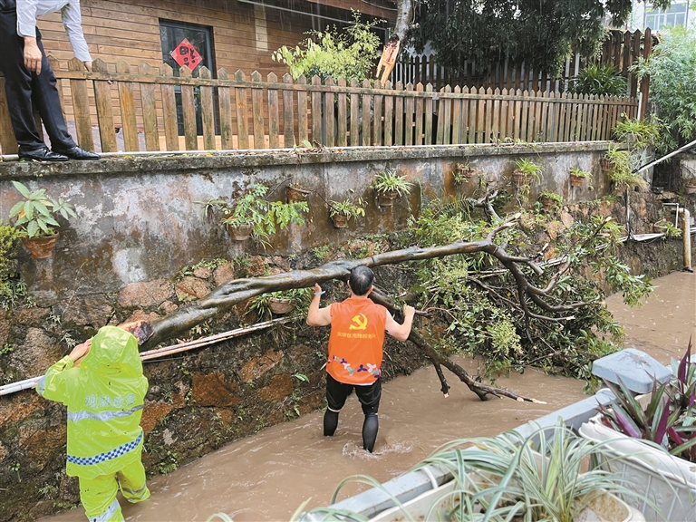 龙华新闻讯(记者 宋彪/文 陈建华/图)3月15日下午,暴雨来袭且越下越大,暴风雨将樟坑径社区上围村东区54-1号房屋河边一棵树木的主枝折断,粗壮的树干砸入河中,与上游漂下的枯枝树叶交织,堵塞河道。由于河道狭窄,水位急剧上涨。危急时刻,正在巡查的社区工作人员陈明翔、邓志远看到热心居民发出的信息,迅速赶到现场疏通河道,在随后赶来的其他巡查人员和物业人员的协作下,冒雨奋战半个多小时,成功化解险情,展现了社区党员骨干先锋模范的勇敢与担当。