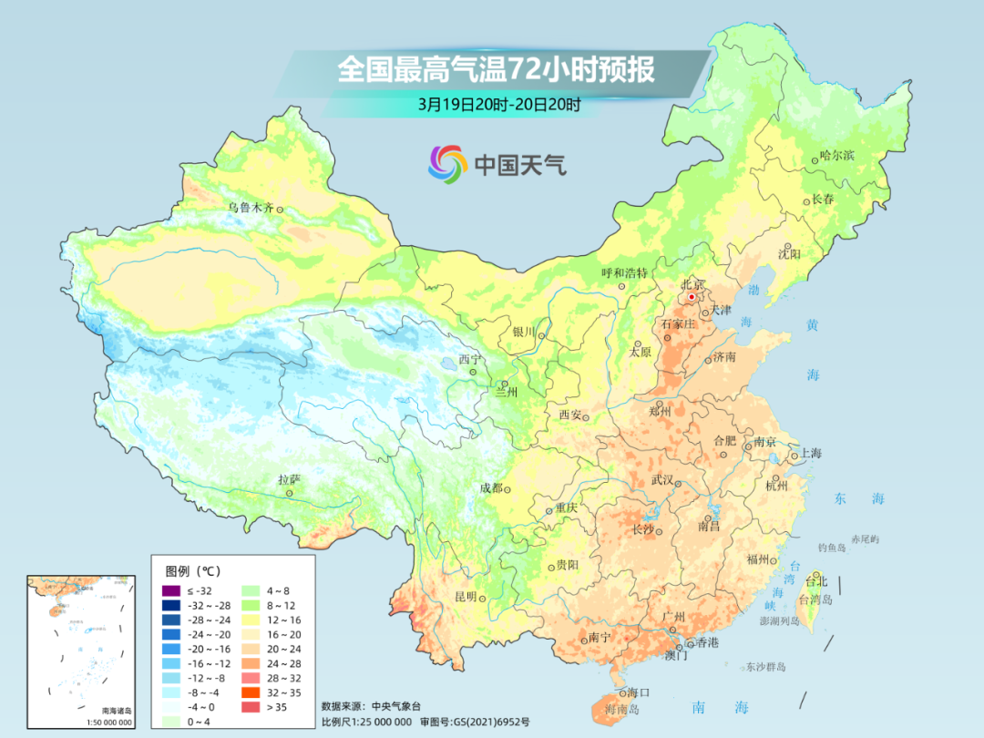 从3月19日开始,这波大回暖将持续到周末前后,最高气温20℃线将一路北推到东北地区南部!华北南部、黄淮等地最高气温将超过25℃,暖出新高度!像沈阳、银川、太原、西安今年都将首次达到20℃,北京、天津、石家庄、济南、郑州更是有望冲上25℃!京津冀鲁豫一带甚至可能“一脚迈入春天”,东北部分地区也有望提前入春!