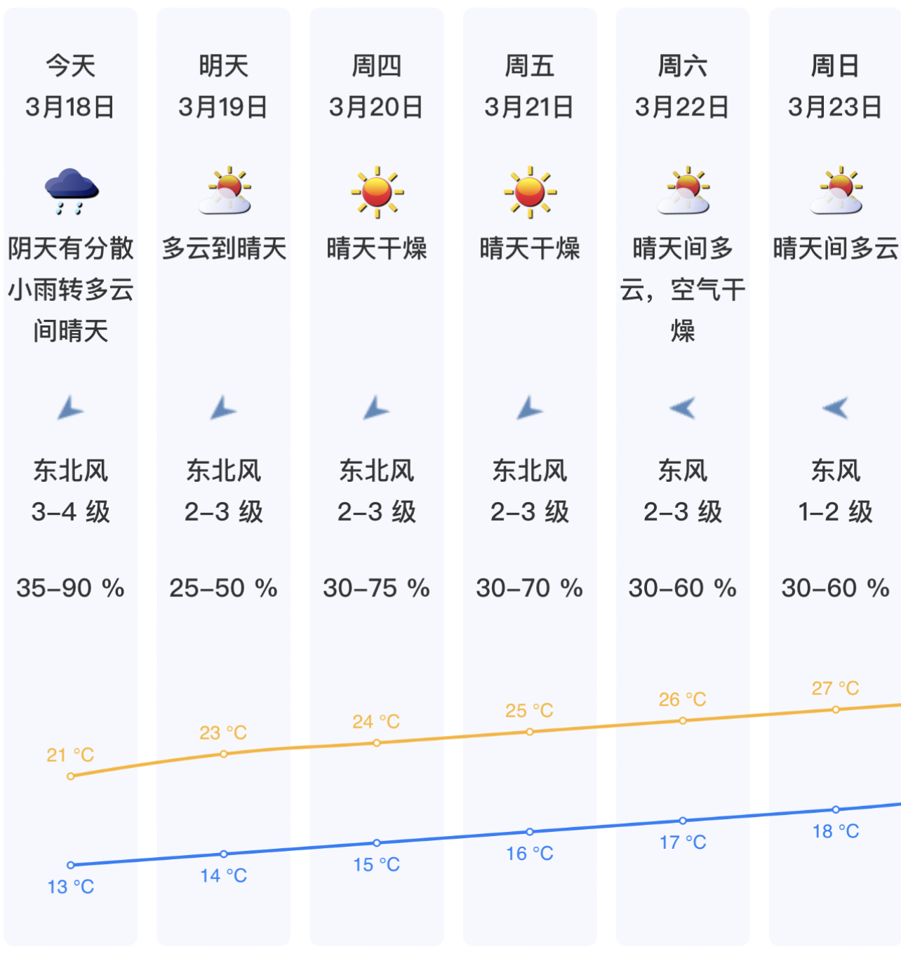 18-19日多云为主,18日气温在13-21℃之间,早晚还是有点凉飕飕的,记得加件外套哦!