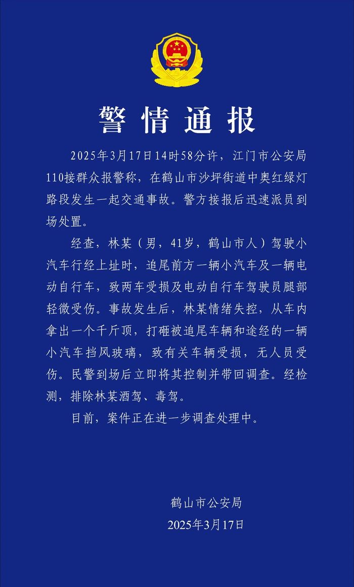 央视网消息:广东鹤山市公安局通报,3月17日14时58分许,江门市公安局110接群众报警称,在鹤山市沙坪街道中奥红绿灯路段发生一起交通事故。警方接报后迅速派员到场处置。经查,林某(男,41岁,鹤山市人)驾驶小汽车行经上址时,追尾前方一辆小汽车及一辆电动自行车,致两车受损及电动自行车驾驶员腿部轻微受伤。事故发生后,林某情绪失控,从车内拿出一个千斤顶,打砸被追尾车辆和途经的一辆小汽车挡风玻璃,致有关车辆受损,无人员受伤。民警到场后立即将其控制并带回调查。经检测,排除林某酒驾、毒驾。目前,案件正在进一步调查处理中。