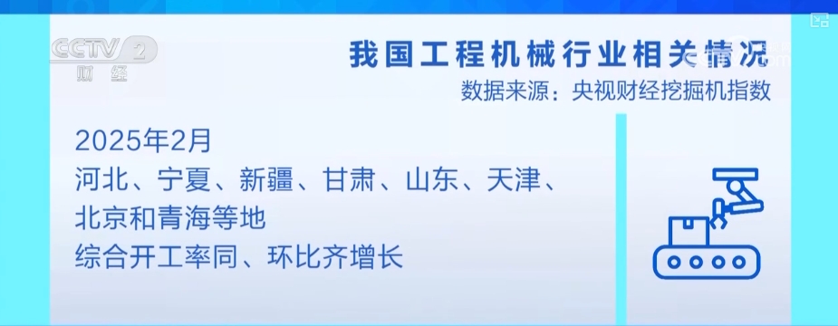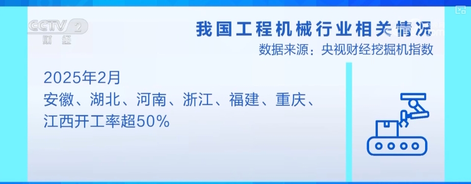 “央视财经挖掘机指数”显示,2025年2月份,全国工程机械开工率为35.10%。虽然2月份横跨春节和元宵节,但是河北、宁夏、新疆、甘肃、山东、天津、北京和青海等地,综合开工率同比和环比均出现增长。安徽、湖北、河南、浙江、福建、重庆、江西的开工率超过50%。