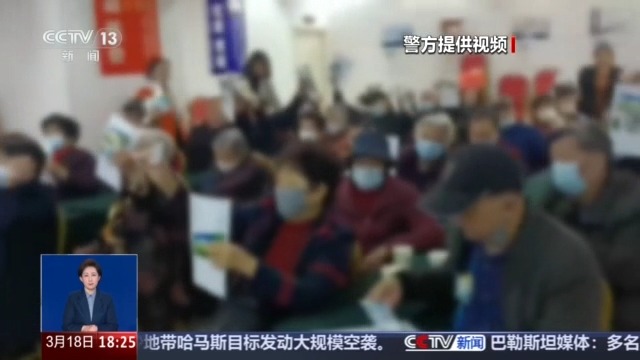 警方提供的一段视频显示,几十位老人在店员的指引下举起手中彩色的宣传页和纸币。